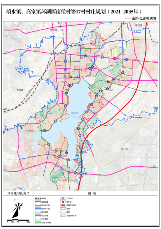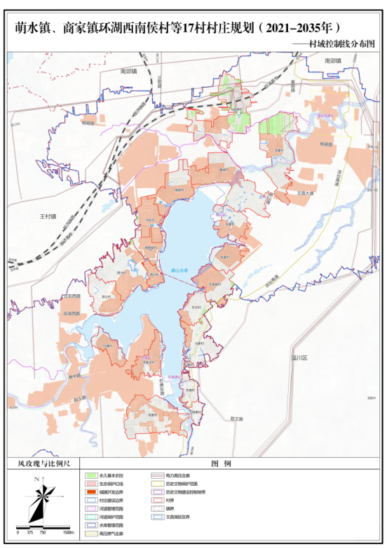 《萌水镇、商家镇环湖西南侯村等17村 村庄规划(2021-2035年)》主要内容简介 一、总则 1.规划期限 近期:2021年-2028年; 远期:2029年-2035年。 2.规划范围 本次规划范围为萌水镇西南侯村、马庄村、南唐村、夏侯村、前坡村、泽崖村、张家村、东南侯村,商家镇东岔村、冯家村、东商村、馆里村、李家庄村、红旗村、双山村、西马村、西岔村村域范围内城镇开发边界范围以外的全部国土空间,总面积1063.88公顷。其中萌水镇西南侯村23.93公顷、马庄村11.23公顷、南唐村38.45公顷、夏侯村123.81公顷、前坡村152.52公顷、泽崖村122.88公顷、张家村71.28公顷、东南侯村46.71公顷,商家镇东岔村47.35公顷、冯家村79.99公顷、东商村41.17公顷、馆里村117.19公顷、李家庄村17.33公顷、红旗村16.86公顷、双山村55.67公顷、西马村93.43公顷、西岔村4.08公顷。 3.规划发展定位 萌水镇西南侯村、马庄村、南唐村、夏侯村、前坡村、泽崖村、张家村、东南侯村为城郊融合类村庄。 商家镇东岔村、馆里村、李家庄村、红旗村、双山村、西马村、西岔村为城郊融合类村庄,冯家村、东商村为搬迁撤并类村庄。 为积极融入省会经济圈,借助济淄交通同城共联以及齐鲁科创大走廊延伸契机,充分利用济淄同城重要节点的区位优势、自身的生态环境及旅游基础优势,围绕文昌湖旅游度假区“以建设全域公园城市为契机,构建集水上运动、文旅融合、休闲娱乐、智慧体育的环湖活力体系”的发展思路,做大做强文旅产业,构建生活舒适、环境优美、交通便捷、配套完善、展现自然旅游和生态文化的富美宜居乡村。 二、村庄规划内容 1.村域土地利用规划 规划远期2035年,规划范围内村庄建设用地规模控制在38.56公顷以内。其中:西南侯村村庄建设用地规模控制在2.44公顷以内,马庄村村庄建设用地规模控制在0.82公顷以内,南唐村村庄建设用地规模控制在2.25公顷以内,夏侯村村庄建设用地规模控制在1.49公顷以内,前坡村村庄建设用地规模控制在2.66公顷以内,泽崖村村庄建设用地规模控制在1.63公顷以内,张家村村庄建设用地规模控制在9.84公顷以内,东南侯村村庄建设用地规模控制在1.71公顷以内,东岔村村庄建设用地规模控制在2.05公顷以内,冯家村村庄建设用地规模控制在2.66公顷以内,东商村村庄建设用地规模控制在4.58公顷以内,馆里村村庄建设用地规模控制在2.11公顷以内,李家庄村村庄建设用地规模控制在0.86公顷以内,红旗村村庄建设用地规模控制在0.10公顷以内,双山村村庄建设用地规模控制在1.95公顷以内,西马村村庄建设用地规模控制在0.99公顷以内,西岔村村庄建设用地规模控制在0.93公顷以内。 2.三区三线规划 (1)生态空间 至2035年,生态空间主要由林地、草地、河流水面、裸土地、裸岩石砾地组成。总面积698.49公顷,占规划总面积的65.66%。 (2)建设空间 至2035年,建设空间规模133.52公顷,占规划总面积的12.55%。其中城镇建设用地规模0.64公顷,村庄建设用地规模38.56公顷,区域基础设施用地规模87.86公顷,其他建设用地规模6.47公顷。 (3)农业空间 至2035年,农业空间主要由耕地、园地、农业设施建设用地、沟渠、坑塘水面、田坎组成。总面积为231.87公顷,占规划总面积的21.79%。 (4)生态保护红线 规划落实生态保护红线面积41.65公顷。 (5)永久基本农田保护红线 规划落实永久基本农田面积不低于55.87公顷。 (6)村庄建设边界 村庄建设边界为村庄建设用地边界线,面积为38.56公顷。一经批准不得擅自修改,确需修改的,应按程序报相应审批机关批准。 3.生态修复与土地综合整治规划 对村域生态系统进行综合保护,包括水域湿地修复、森林草原修复。 开展国土综合整治,包括建设用地整治、农用地整治。 4.产业发展与布局规划 规划期末,结合土地规划及产业发展策略,构建五大产业功能区,即:环湖旅游发展核心区、萌山公园景观区、城镇发展区、城乡融合发展区、生态林业发展区。 5.历史文化保护规划 规划落实萌山寺的保护要求,保护范围划定为:院墙四周向外30米;建设控制地带划定为:保护范围四周向外30米。 规划落实东商遗址的保护要求,保护范围划定为:以村北的滨博高速西200米为基点,向北200米,向西至水库边,大体呈方形;建设控制地带划定为:保护范围四周向外10米。 规划落实石佛寺的保护要求,保护范围划定为:院墙四周外扩20米;建设控制地带划定为:保护范围四周向外30米。 规划落实皇姑顶遗址的保护要求,保护范围划定为:遗址中心四周向外500米;建设控制地带划定为:保护范围四周向外10米。 文物保护单位的保护范围内不得进行其他建设工程或者爆破、钻探、挖掘等作业。但是,因特殊情况需要在文物保护单位的保护范围内进行其他建设工程或者爆破、钻探、挖掘等作业的,必须保证文物保护单位的安全,并经核定公布该文物保护单位的人民政府批准,在批准前应当征得上一级人民政府文物行政部门同意。 在文物保护单位的建设控制地带内进行建设工程,不得破坏文物保护单位的历史风貌。工程设计方案应当根据文物保护单位的级别,经相应的文物行政部门同意后,报城乡建设规划部门批准。 在文物保护单位的保护范围和建设控制地带内,不得建设污染文物保护单位及其环境的设施,不得进行可能影响文物保护单位安全及其环境的活动。对已有的污染文物保护单位及其环境的设施,应当限期治理。 