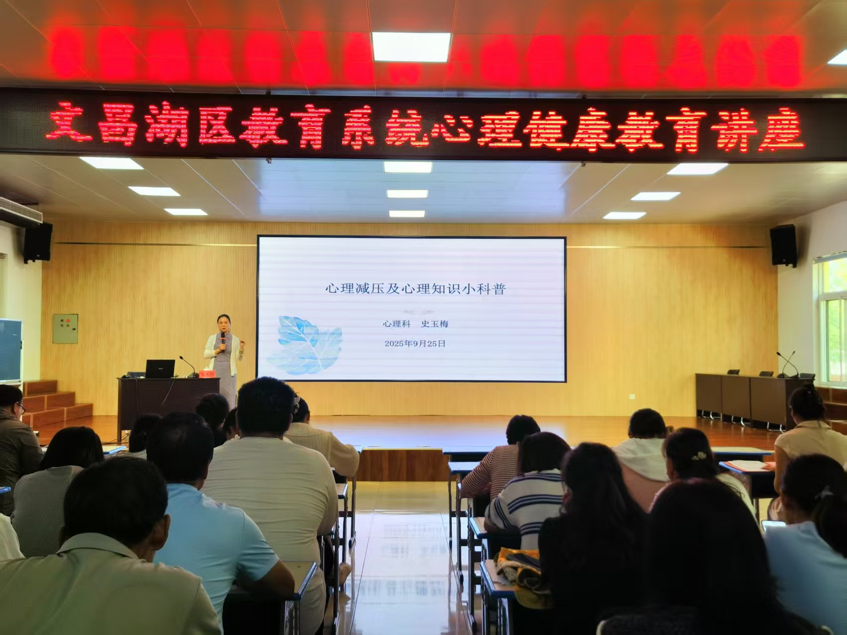 为贯彻落实市委和省总工会关于推进高品质民生建设工作要求,切实提升职工心理健康服务质效,根据《关于推进职工健康保障暨“心理服务+”平台建设的通知》(淄工发〔2025〕9号)要求,市工会事业综合服务中心组织市职工心理健康志愿服务专家讲师团深入基层开展职工心理健康公益性讲座,由文昌湖区总工会牵头组织,文昌湖区教育工会于9月25日有幸邀请到淄博市职工心理健康服务专家讲师团成员史玉梅老师,为全区教育系统做了一场题为《心理减压科普及体验活动》的精彩健康辅导讲座。全区教育系统各基层工会教职工代表90余人聆听了辅导讲座。