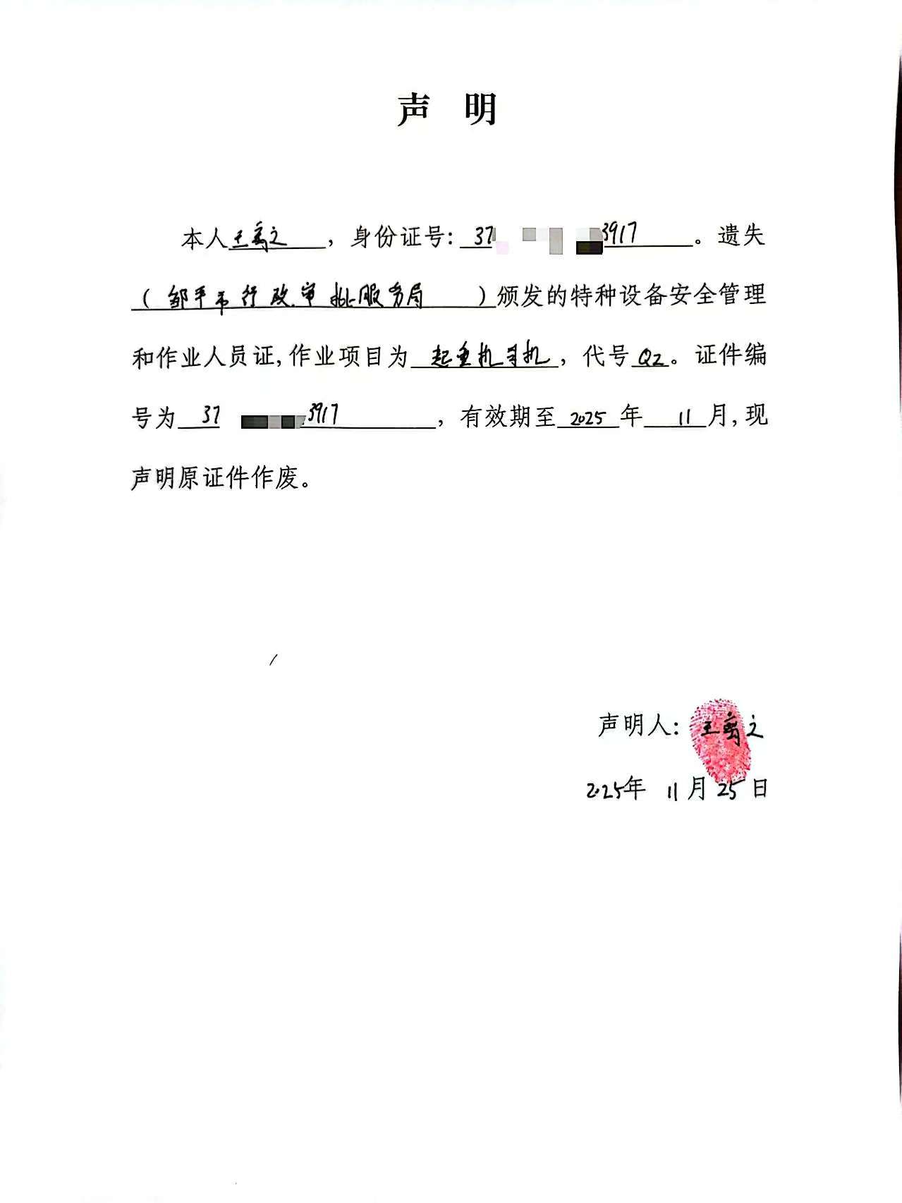 特种设备作业人员证书遗失声明