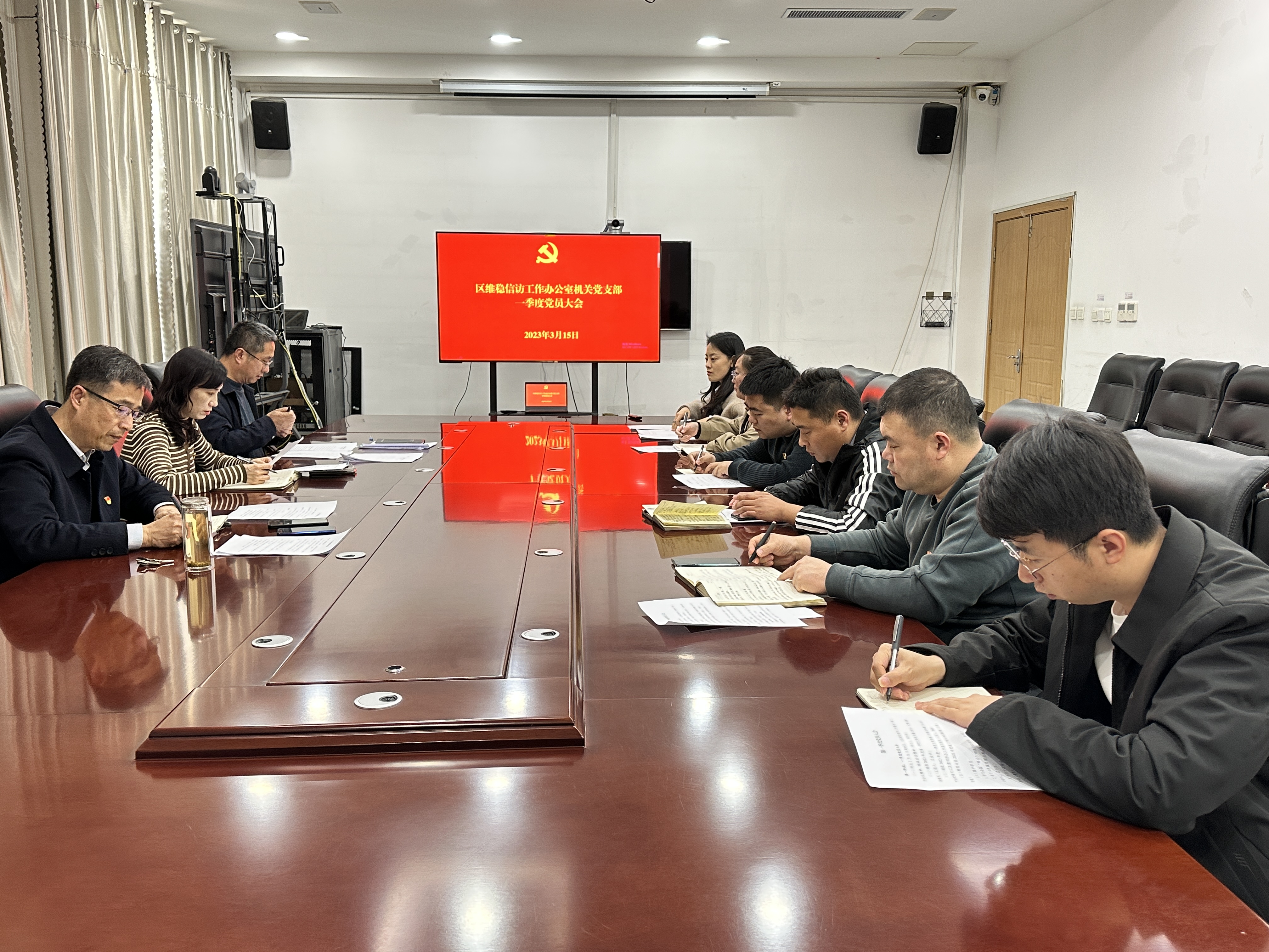 2023年3月15日,区维稳信访工作办公室机关党支部组织召开2023年一季度党员大会,会上对一季度党员量化积分及党费交纳情况进行通报,通报2023年度一季度支部党建工作情况和履行全面从严治党情况,研究讨论2023年党建工作重点和思路措施。各位党员集体学习全国“两会”相关内容和学习《李强总理出席记者会并回答中外记者提问》。区维稳信访工作办公室机关支部开展题为《弘扬伟大建党精神,全面深入学习二十大精神》上党课活动 。